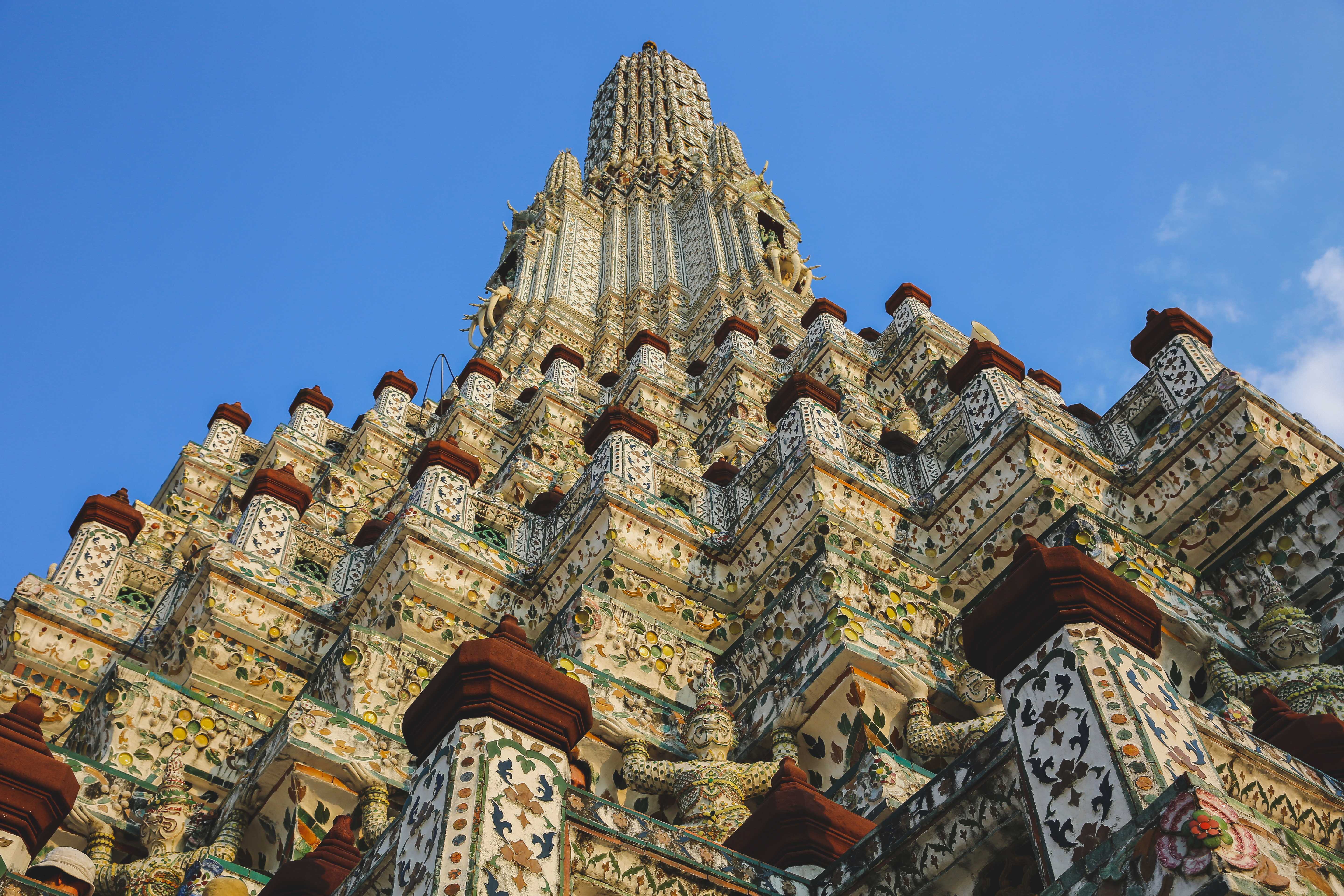 Even though Wat Arun is a temple, it really deserves its own category as the most recognized temple in Bangkok. Wat Arun stands out from the rest of the temples in Bangkok with its white porcelein exterior decorated with many different colored tiles and seashells that reflect the sun. It stands about 75 meters tall and is a famous landmark to easily see from the Chao Praya River. As evening comes around, the temple is lit up. You can get a really good view from opposite side of the river. The best time to go to Wat Arun is sunrise or sunset to avoid some of the crowds and the humid heat.
